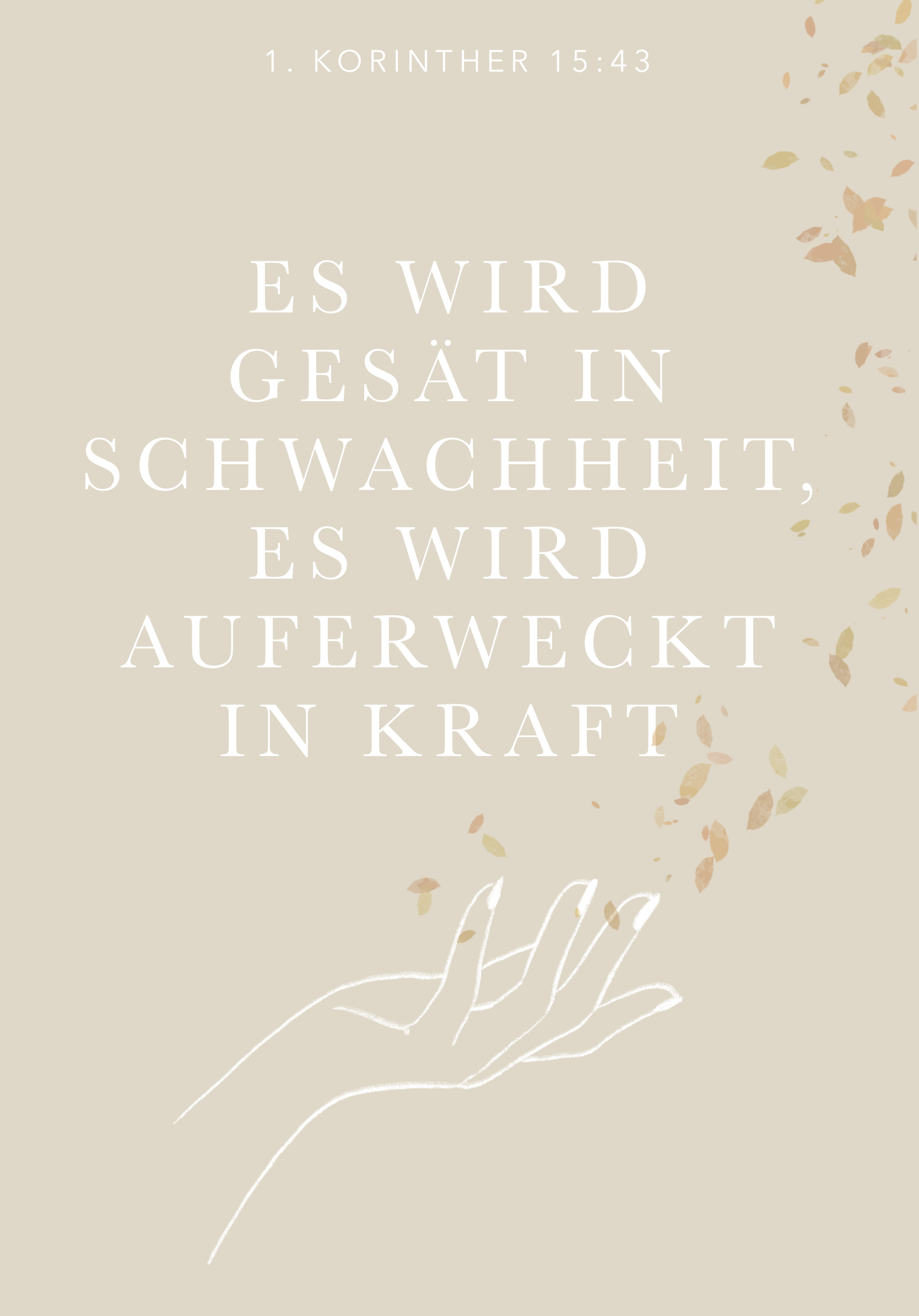 Bibelvers; 1. Korinther 15:43; Es wird gesät in Schwachheit, es wird auferweckt in Kraft; Beige; Hand; Blätter