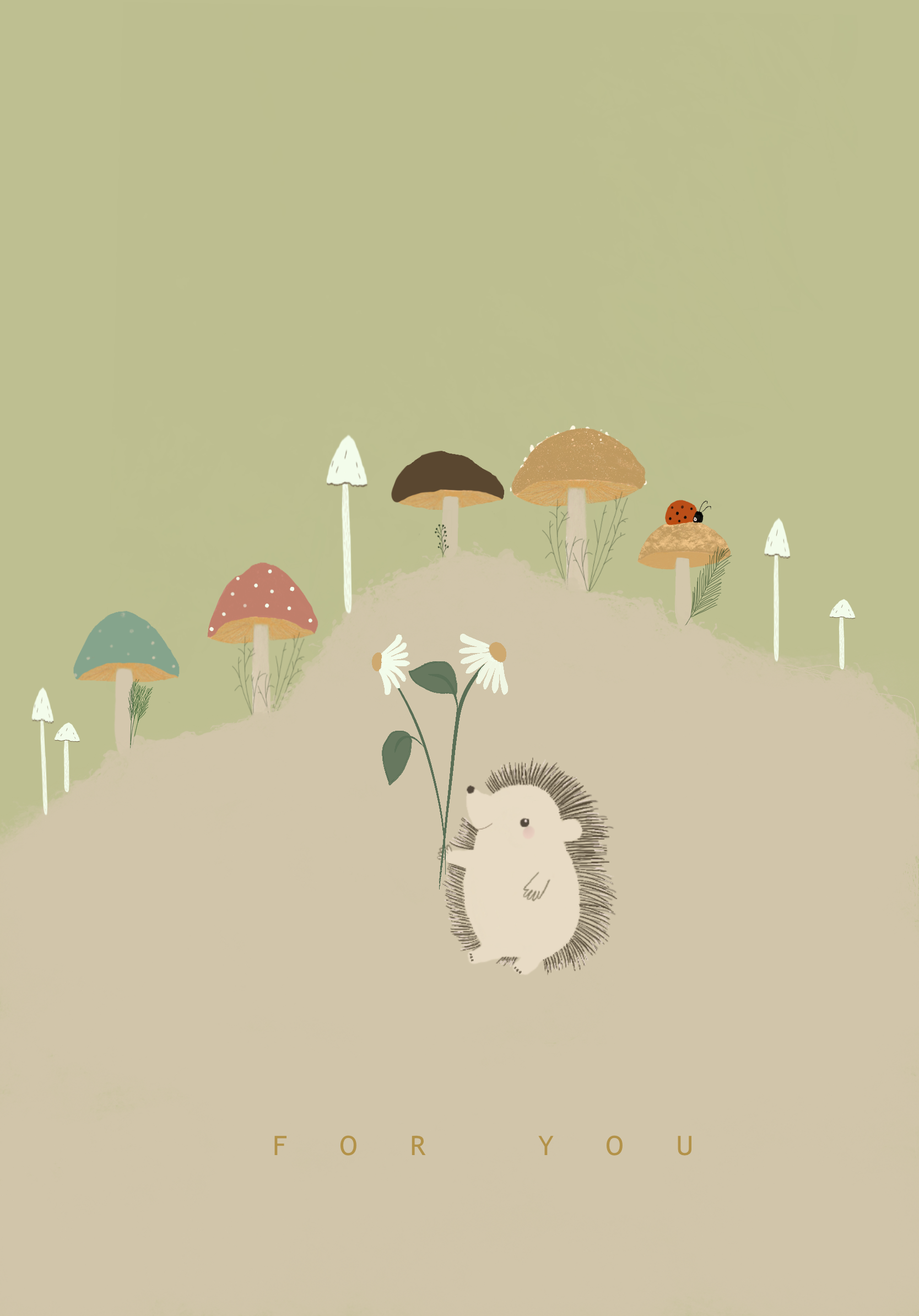 Postkarte; For You; Igel mit Blumen; Pilze; Marienkäfer; Geburtstagskarte; Geschenkkarte