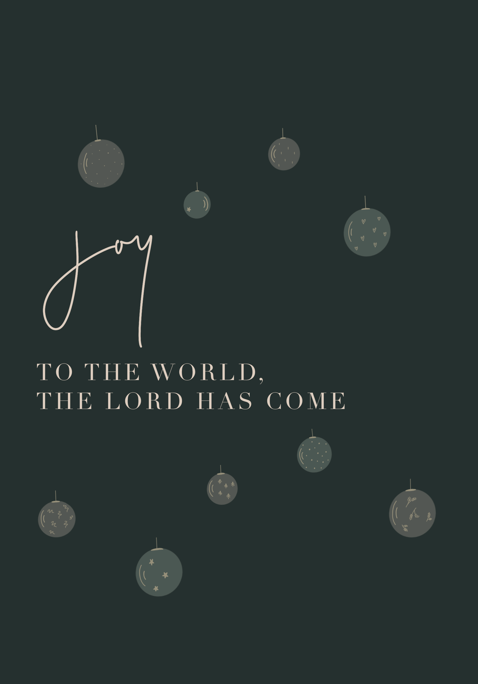 Weihnachtskarte; Joy to the world, the lord has come; Weihnachtskugeln; grün